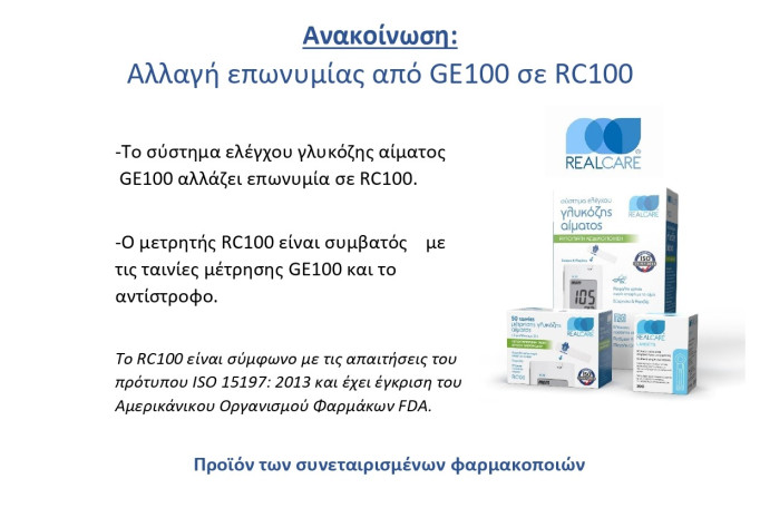 Θα θέλαμε να σας ενημερώσουμε για την αλλαγή της επωνυμίας του συστήματος μέτρησης γλυκόζης αίματος από GE100 σε RC100. Από την Τέταρτη 12 Οκτωβρίου θα παραλαμβάνετε το σύστημα μέτρησης γλυκόζης αίματος υπό την επωνυμία RC100.